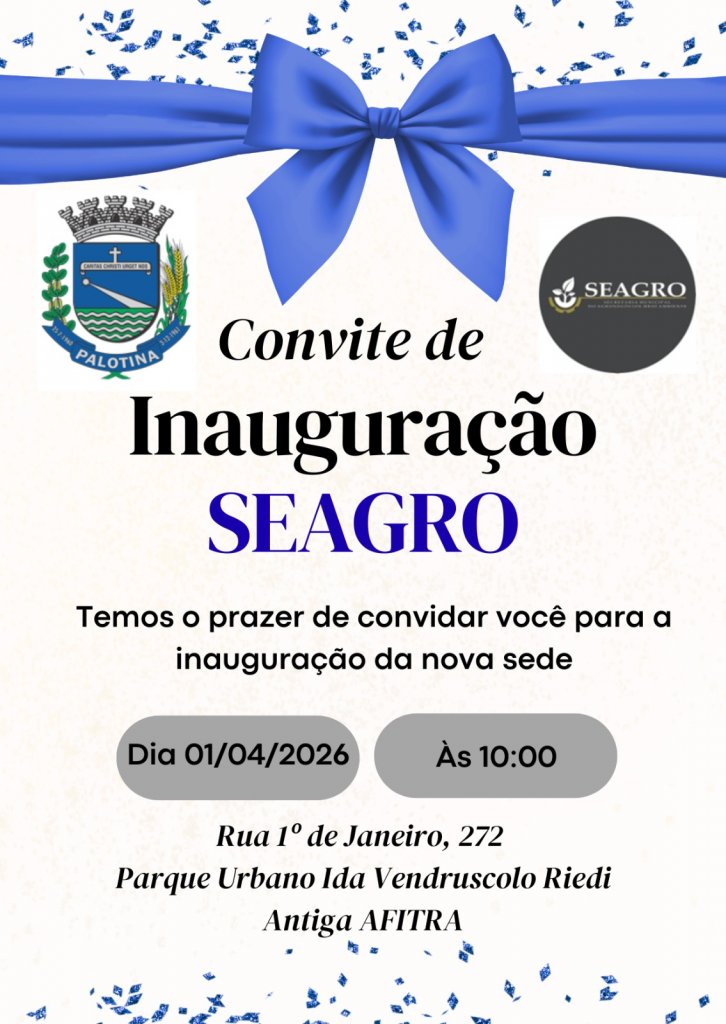 A SEAGRO realiza no próximo dia 1º de abril de 2026 a inauguração de sua nova sede, em Palotina. O evento está marcado para às 10h e reunirá convidados, autoridades e membros da comunidade.