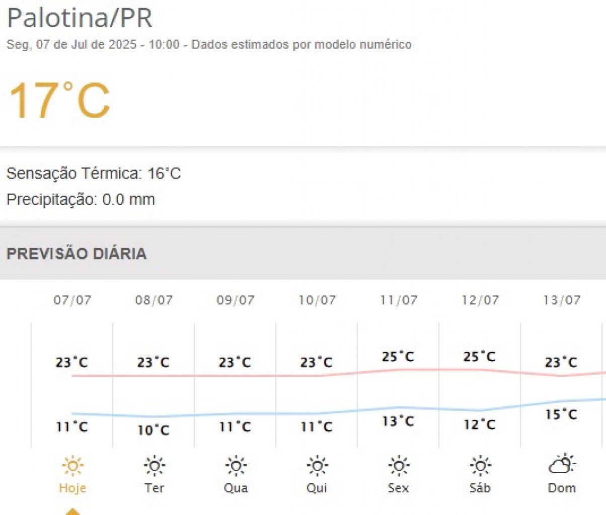De acordo com o Simepar, não há previsão de frio intenso para Palotina durante esta semana. O frio mais rigoroso segue restrito a regiões como centro-sul, Campos Gerais, Região Metropolitana de Curitiba e litoral, onde as mínimas têm ficado entre 1 °C e 6 °C. No oeste do estado, o clima permanece mais ameno, com temperaturas mais elevadas e sem registros de geada.