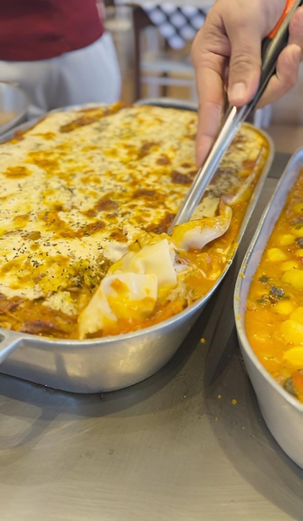 Entre as opções estão diversas saladas frescas, massas, lasanhas e pratos quentes.
