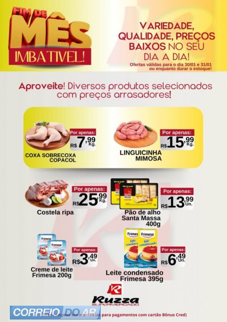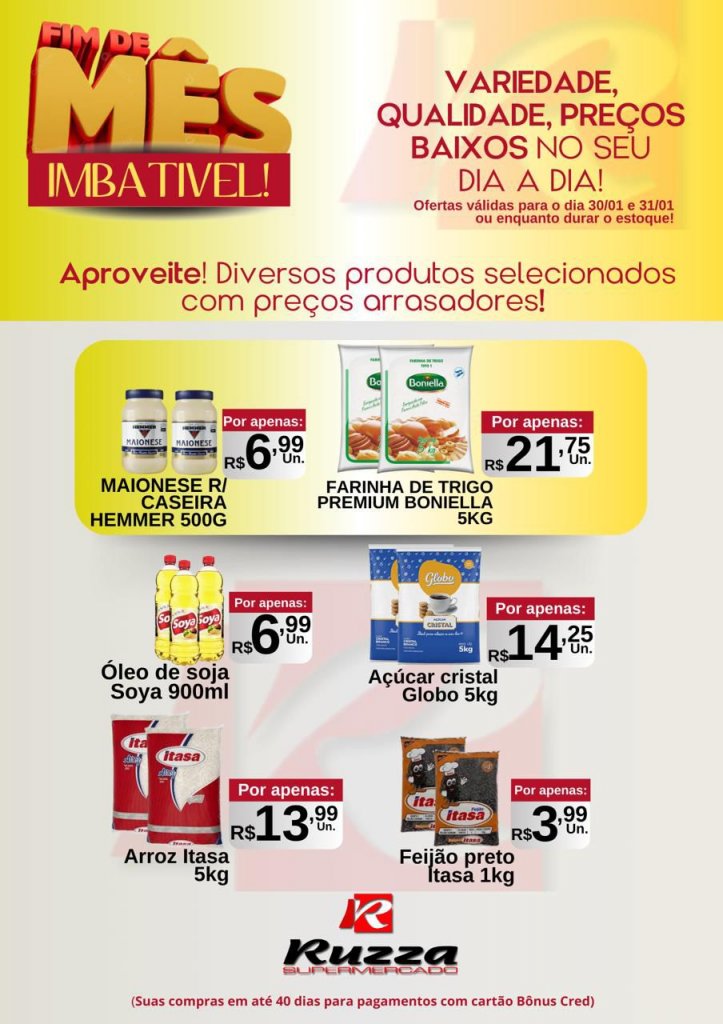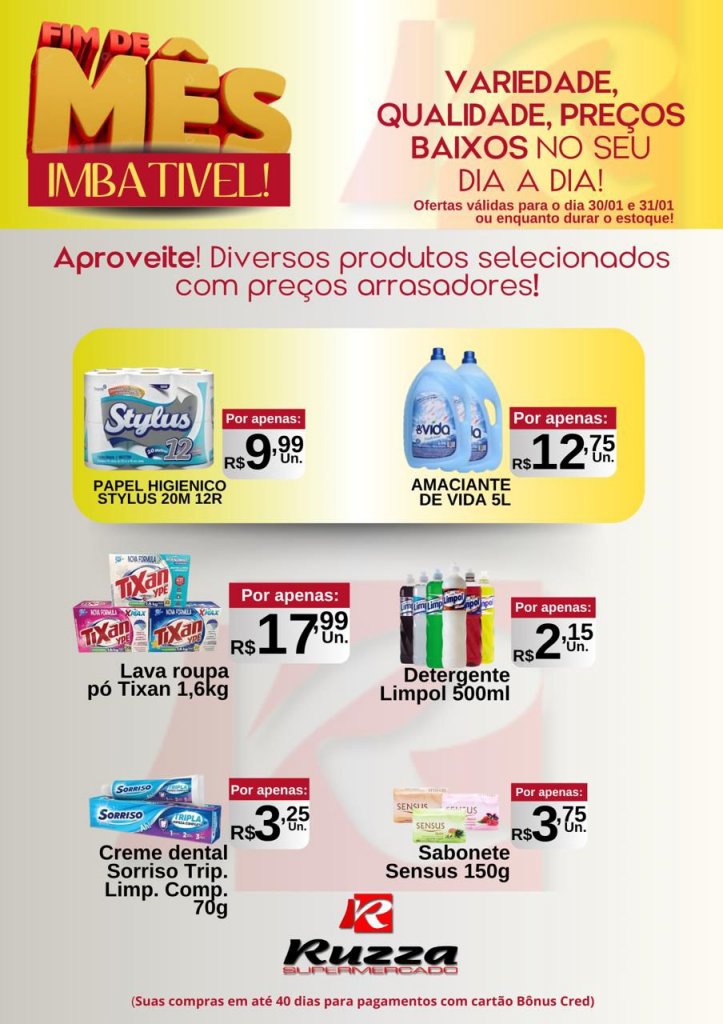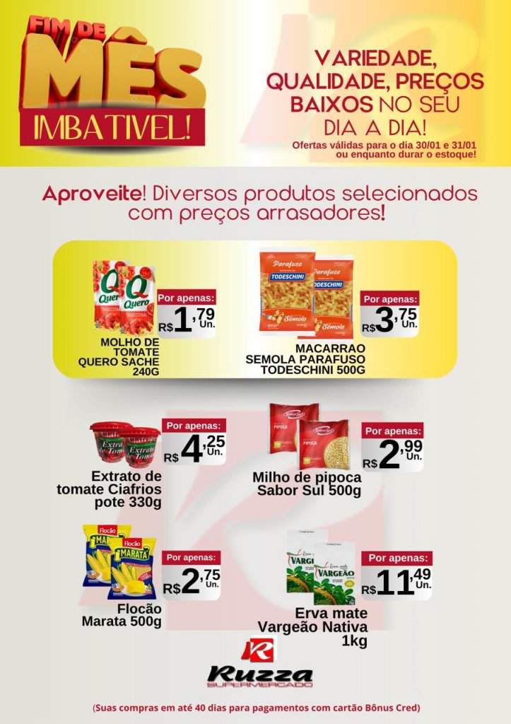 O momento de economizar chegou! No Fim de Mês Imbatível, o Supermercado Ruzza traz descontos especiais em produtos selecionados para você aproveitar o melhor sem pesar no bolso.