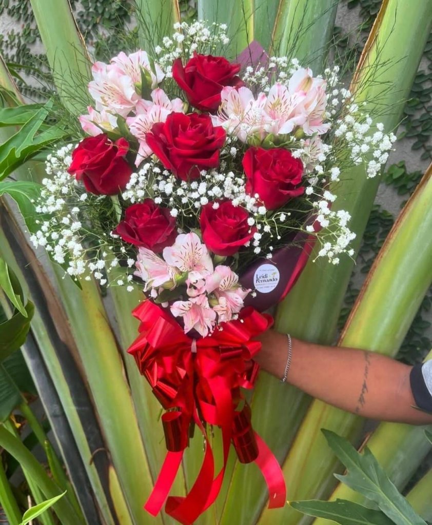 A floricultura oferece desde clássicos buquês de rosas vermelhas até combinações delicadas com astromélias e gypsophilas, além de girassóis vibrantes que transmitem alegria.