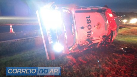 Viatura da PMPR capota após acidente na BR-277 em São Miguel do Iguaçu