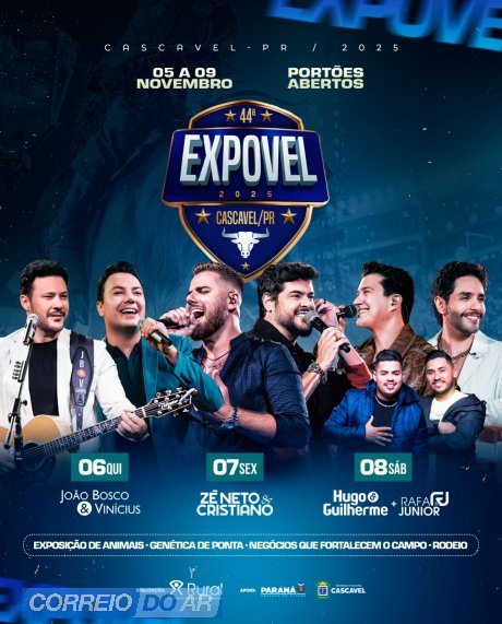 Pela primeira vez em mais de quatro décadas, a Expovelabrirá seus portões de forma totalmente gratuita. De 5 a 9 de novembro, o Parque de Exposições Celso Garcia Cid será palco de shows, rodeios, exposições de animais e gastronomia sem cobrança de ingresso. A expectativa também é de quebra de recorde, com um público superior a 100 mil pessoas nos cinco dias.