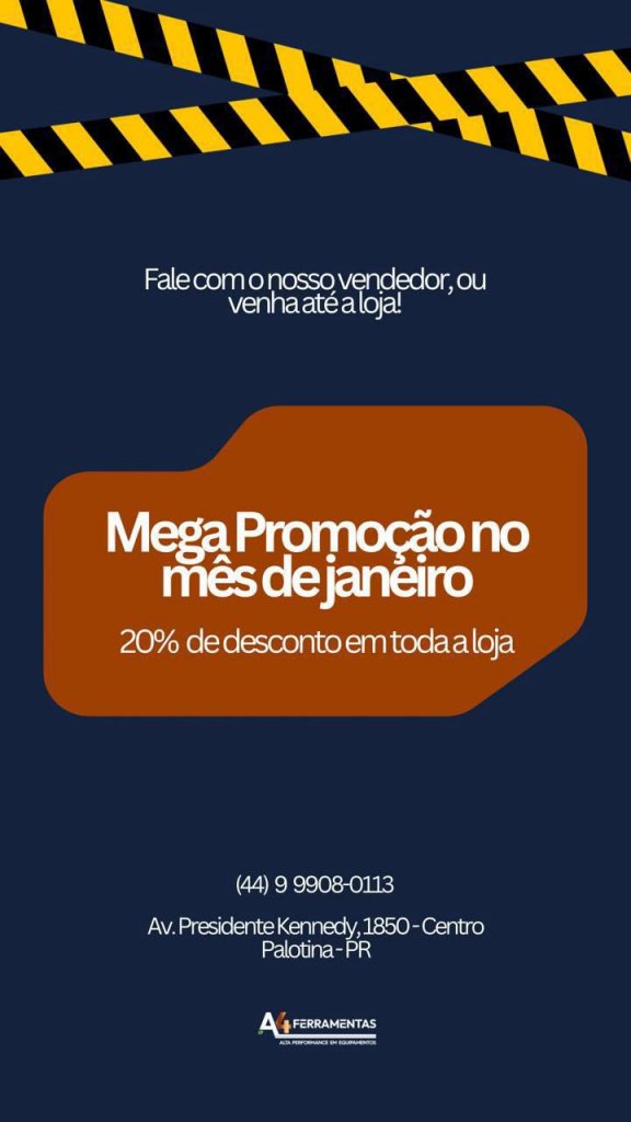 A A4 Ferramentas, referência em alta performance em equipamentos em Palotina, iniciou janeiro com uma mega promoção, oferecendo 20% de desconto em toda a loja, válida durante todo o mês.
