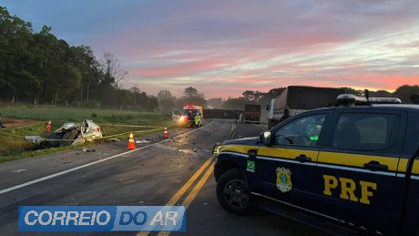 A batida aconteceu por volta das 4 horas, no km 259 da rodovia, quando o Gol cinza, de São José do Rio Preto (SP), atingiu de frente o caminhão Volvo branco, de Guamiranga (PR), que transportava farelo de soja nos semi-reboques.