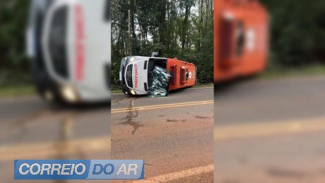 Após pneus estourar, Gol bate contra ambulância e veículo tomba na PR-493
