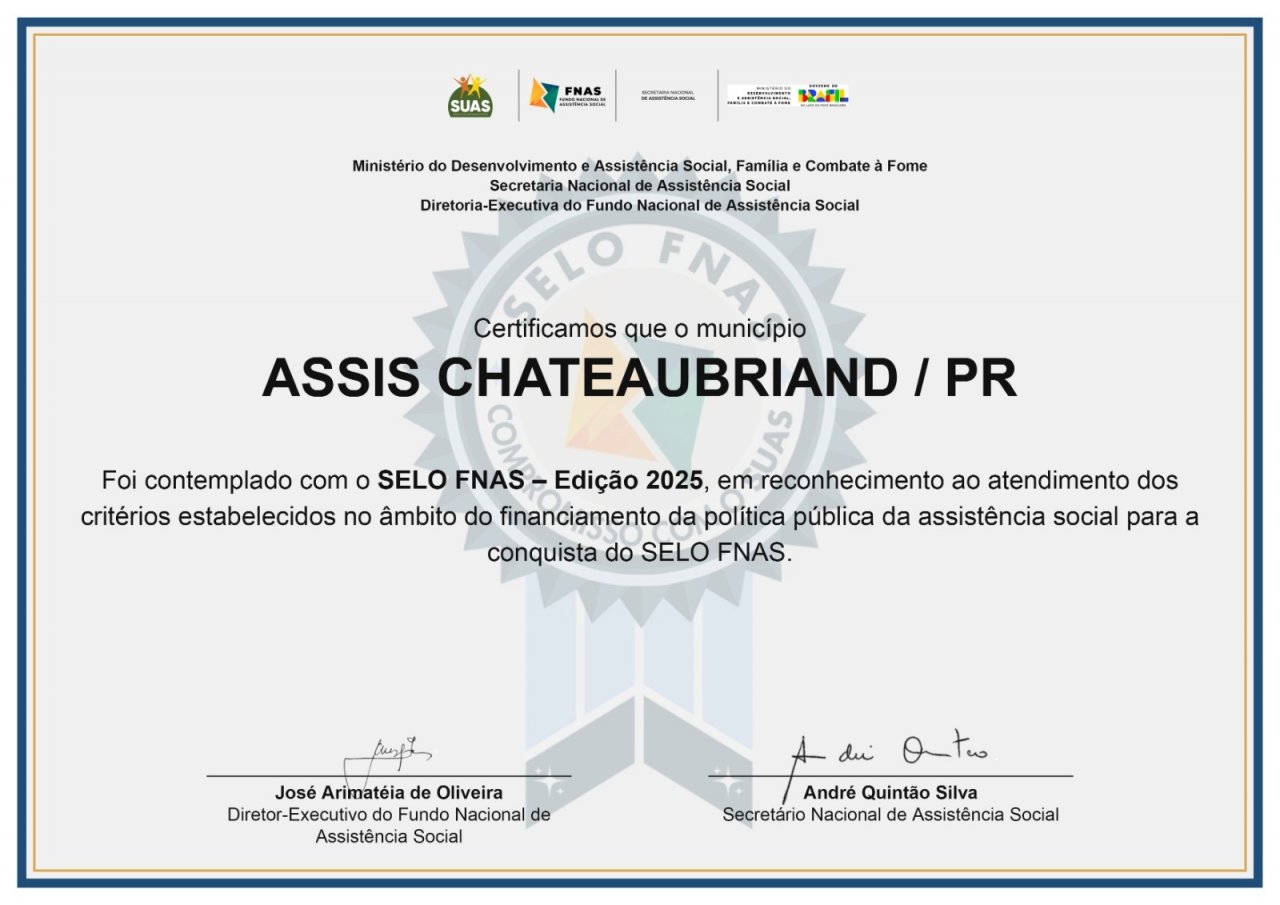 Assis Chateaubriand conquista Selo FNAS 2025 pelo compromisso com a gestão do SUAS