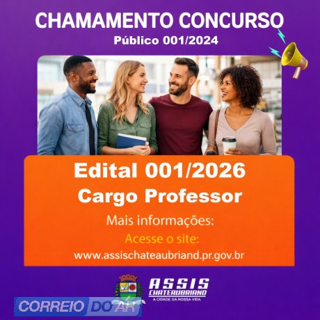 Publicado nesta quarta-feira (14), em diário oficial do município de Assis Chateaubriand, o edital 001/2026, tratando-se da trigésima convocação de candidato habilitado no concurso público 01/2024, visando à nomeação no cargo de Professor. Os candidatos convocados devem entregar os documentos junto ao Recursos Humanos, entre os dias 14, 15, 16, 19 e 20 de janeiro