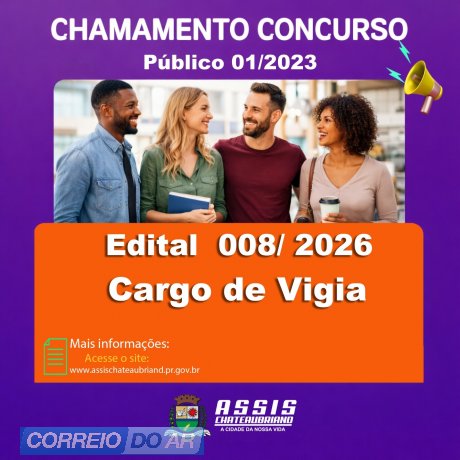 Publicado nesta quinta-feira (5), em diário oficial do município de Assis Chateaubriand, o edital 008/ 2026, tratando-se da sexagésima primeira convocação de candidato habilitado no concurso público 01/2023, visando à nomeação no cargo de vigia de candidato habilitado no concurso público 01/2023.