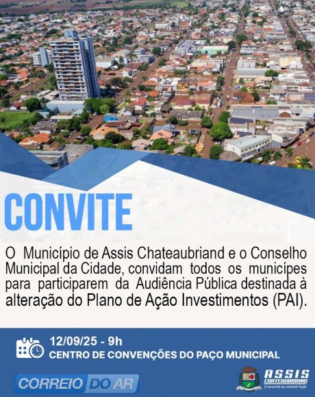 Na próxima sexta-feira, dia 12, a Prefeitura de Assis Chateaubriand, e o Conselho Municipal da Cidade, realizará uma Audiência Pública para discutir alterações no Plano de Ação e Investimentos (PAI). O evento ocorrerá às 9h, no Centro de Convenções do Paço Municipal, e tem como objetivo promover transparência e participação popular no planejamento estratégico do município.