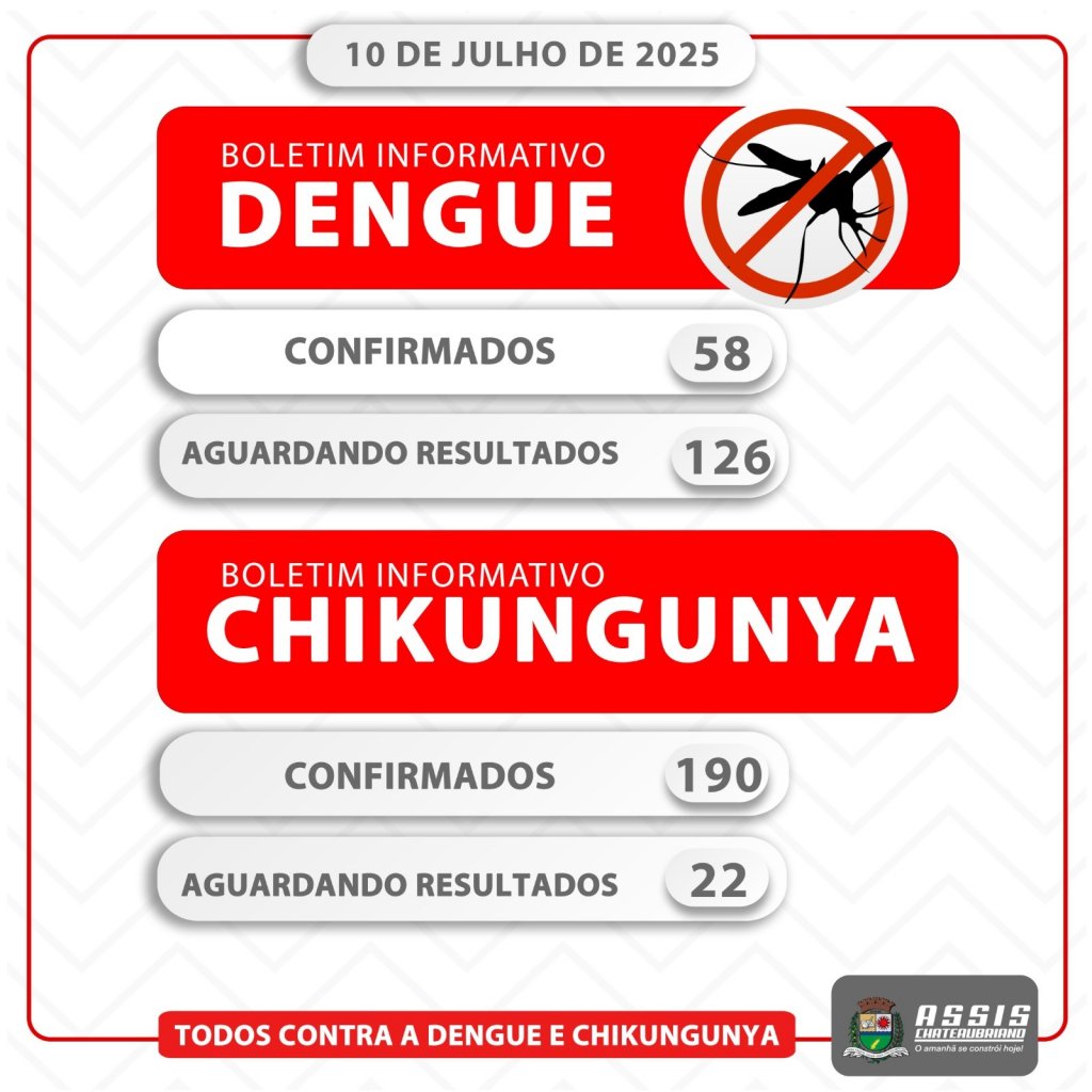 A Secretaria de Saúde de Assis Chateaubriand divulgou, nesta quinta-feira (10), o boletim epidemiológico atualizado com os dados referentes aos casos de dengue e chikungunya no município. As informações abrangem o atual ano epidemiológico, iniciado em 1º de janeiro de 2025, e apresentam um panorama detalhado da situação.