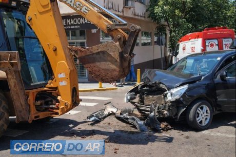 Batida entre carro e retroescavadeira causa danos no Centro de Toledo