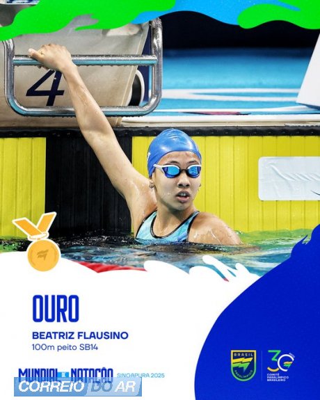 Beatriz Flausino, que disputa o seu primeiro mundial aos 21 anos de idade, completou a prova dos 100 metros peito SB14 com tempo de 1min12s61 para ficar com o ouro. A prata também ficou com uma brasileira, a paranaense Débora Carneiro, que completou a distância em 1min15s08. “Que emoção. Faz muito tempo que eu quero nadar para este tempo, para mostrar que realmente consigo fazer um minuto e 12 segundos. Não tenho palavras para a realização de um sonho, estou muito feliz”, declarou Bia.
