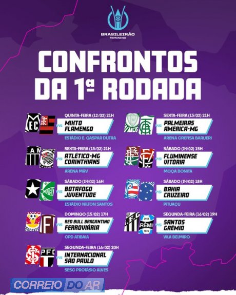 A Série A1 (primeira divisão) do Campeonato Brasileiro Feminino de Futebol 2026 começa daqui a oito dias e já tem datas, locais e horários das partidas das primeiras 10 rodadas. A tabela detalhada do torneio foi divulgada nesta quarta-feira (4) pela CBF. O jogo de abertura será entre Mixto-MT e Flamengo, no dia 12 de fevereiro (uma quinta), às 21 h (horário de Brasília), no Estádio Eurico Gaspar Dutra, em Cuiabá. A partida terá transmissão exclusiva da TV Brasil. O heptacampeão Corinthians estreia um dia depois, fora de casa, contra o Atlético-MG, que retorna este ano à elite do futebol feminino..