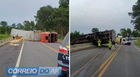 Um caminhão bitrem 9 eixos tombado está bloqueando a BR-277 na manhã desta terça-feira (16) na divisa entre Palmeira e Balsa Nova, nos Campos Gerais do Paraná.