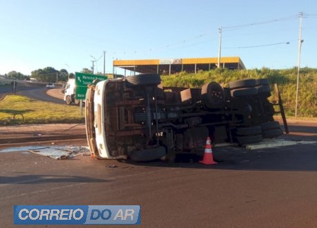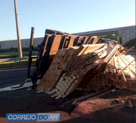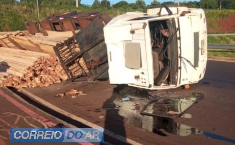 Um caminhão carregado com madeira tombou no final da tarde de quarta-feira (26), por volta das 18h, no viaduto de acesso a Marechal Cândido Rondon, próximo ao portal de entrada na rodovia BR-163.