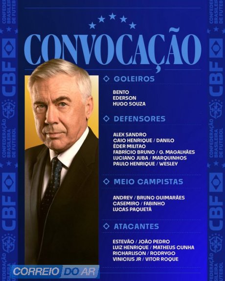 O técnico Carlo Ancelotti convocou a seleção brasileira masculina de futebol nesta segunda-feira (3) para os dois últimos amistosos de 2025, contra Senegal e Tunísia, nos dias 15 e 18 respectivamente, na Europa. As duas equipes já estão asseguradas na Copa do Mundo de 2026. A novidade na lista de 26 jogadores é a presença do lateral-esquerdo Luciano Juba (Bahia). Quem também está de volta à seleção é o atacante Vitor Roque (Palmeiras) e o meio-campista Fabinho (Al-Ittihad/Arábia Saudita) - ambos ganharam a primeira oportunidade com Ancelotti. Vitor Roque não era chamado desde 2023, e Fabinho desde a Copa do Mundo de 2022.