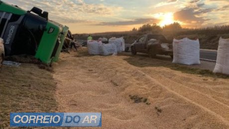 Uma carreta tombou na rodovia BR-163, no quilômetro 204, em Cascavel, nesta quarta-feira (23), após o motorista perder o controle da direção.