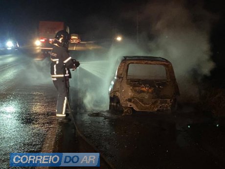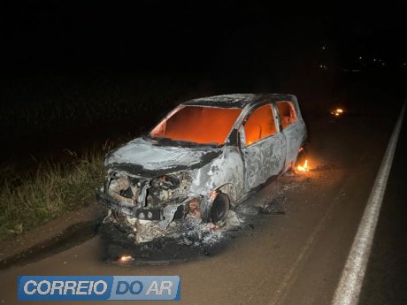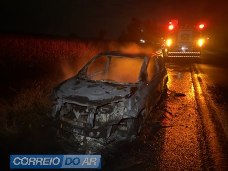 Um carro foi completamente destruído por um incêndio no final da madrugada desta segunda-feira (14), na BR-163, em Mercedes.