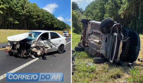 Segundo as informações, a colisão frontal aconteceu durante uma tentativa de ultrapassagem. O impacto provocou sérios danos aos veículos: o Cerato teve a parte dianteira completamente destruída, enquanto o Peugeot 508 tombou ao lado da rodovia.