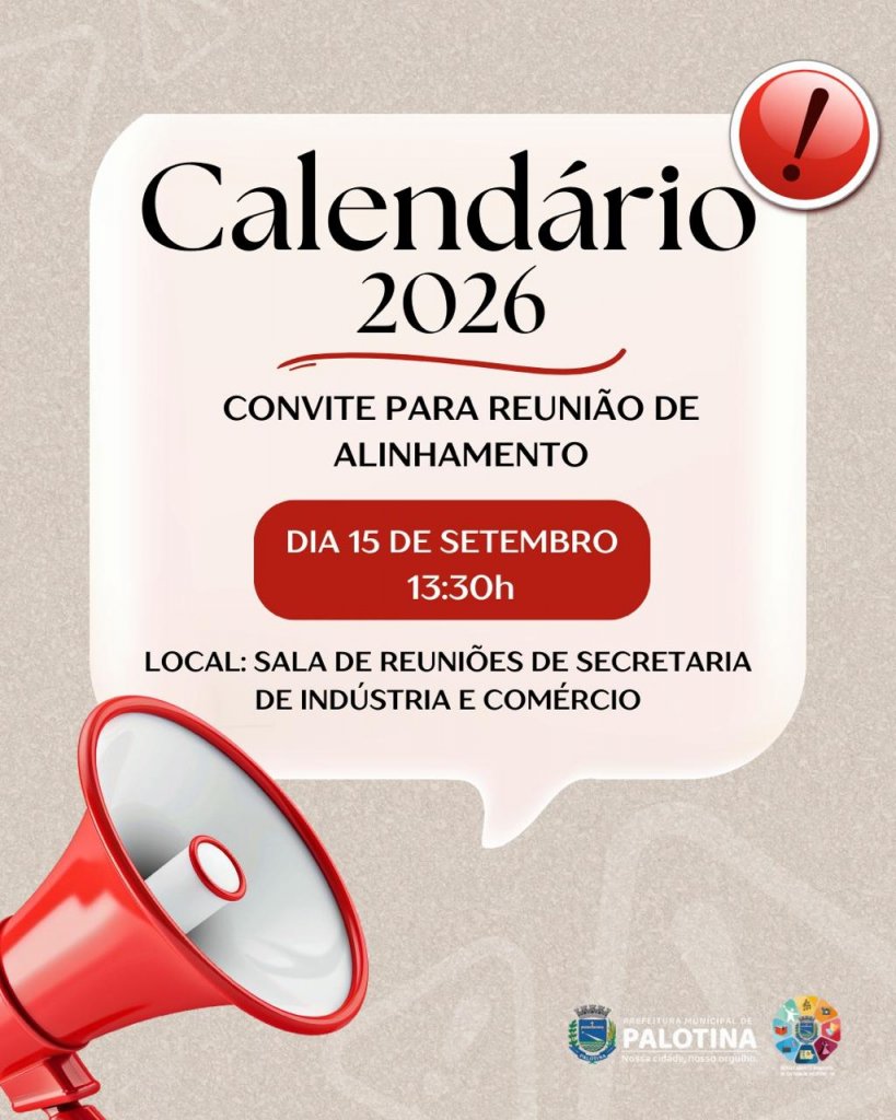 A Prefeitura de Palotina, por meio do Departamento Municipal de Cultura, realizará no próximo dia 15, às 13h30, uma Reunião de Alinhamento referente ao calendário de eventos para o ano de 2026.