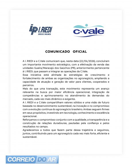 Em nota, conjunta, I.Riedi e C.Vale informam que "a iniciativa está alinhada às estratégias de crescimento e fortalecimento de ambas as organizações no agronegócio, ampliando a capacidade de atuação e geração de valor para clientes, cooperados e parceiros".