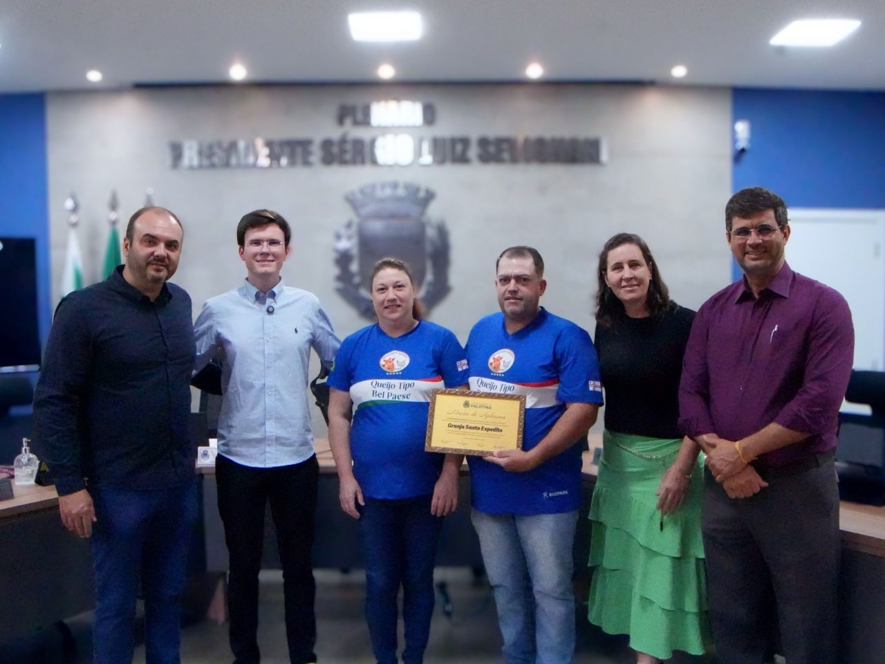 A Câmara Municipal de Palotina aprovou e entregou, em sessão ordinária, uma Moção de Aplausos à Granja Santo Expedito, localizada no Distrito de São Camilo. A homenagem reconhece a excelência e a projeção que a propriedade vem conferindo ao nome do município por meio de premiações estaduais, nacionais e internacionais na produção de queijos artesanais.