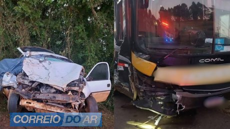 Duas pessoas morreram em acidente na manhã deste sábado (19), no km 450 da BR-277, em Laranjeiras do Sul. A colisão frontal envolveu um ônibus e um automóvel GM/Corsa.