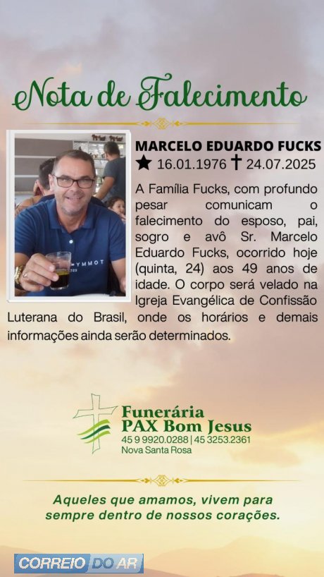 A Família Fucks, com profundo pesar, comunica o falecimento do esposo, pai, sogro e avô. O corpo será velado na Igreja Evangélica de Confissão Luterana do Brasil, em horário ainda a ser confirmado pelos familiares.