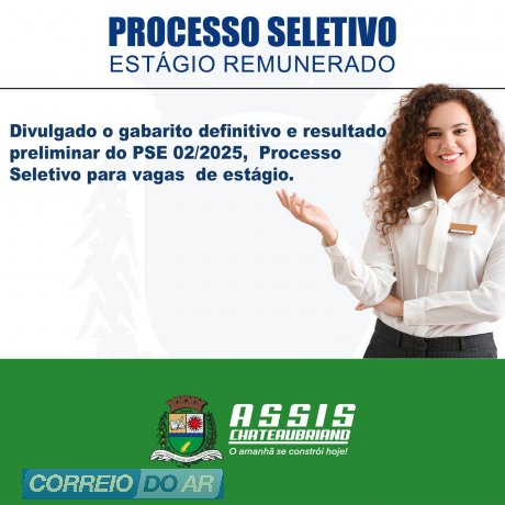 Consta que a Prefeitura Municipal de Assis Chateaubriand, juntamente com a empresa CEBRADE – Central Brasileira de Estágio Ltda–EPP, no uso de suas atribuições tornam público o Gabarito Definitivo e Resultado Preliminar das notas referente ao Processo Seletivo de Estágio Nº 02/2025.