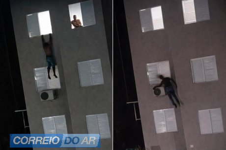 Imagens que circulam nas redes sociais mostram o instante em que o homem salta pela janela do terceiro andar. Durante a queda, ele atinge um aparelho de ar-condicionado instalado na fachada do edifício e, em seguida, se levanta e deixa o local caminhando.