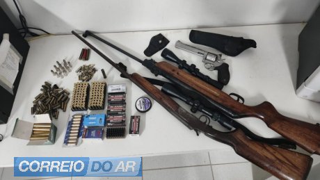 Durante buscas no interior da residência, os policiais localizaram um revólver, duas espingardas — sendo uma de calibre .36 sem registro e outra de pressão, também sem documentação — além de diversas munições dos calibres .38, .22 e cartuchos calibre .36, bem como acessórios como duas lunetas e estojos.