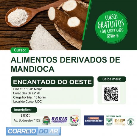 O Município de Assis Chateaubriand informa que estão abertas as inscrições para Cursos de Derivados de Mandioca, que serão realizados no Patrimônio do Silveiropólis, nos dias 2 e 3 de março, e deverão ser feitas no Posto de Saúde da localidade. O treinamento ocorrerá no Salão Comunitário do Silveiropólis, das 8h às 17h