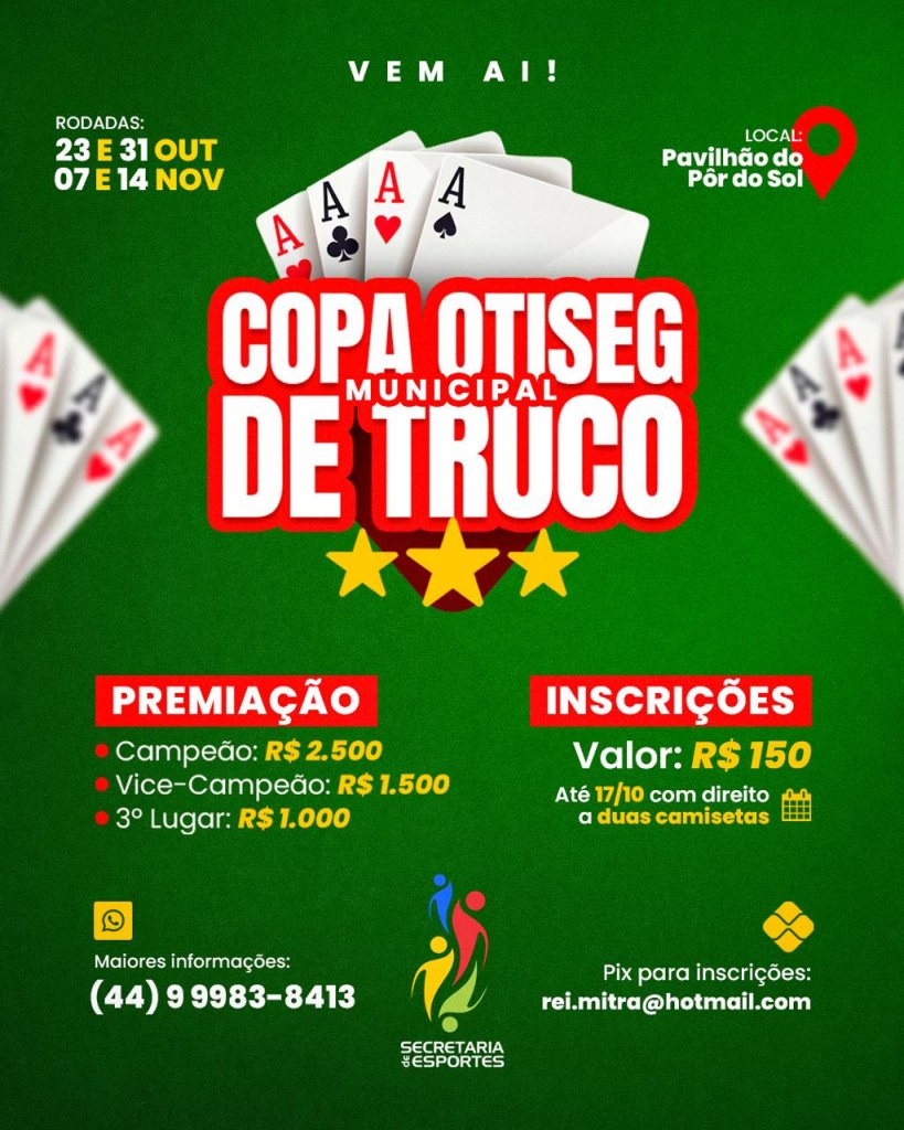 O tradicional jogo de cartas vai reunir os melhores truqueiros da região em mais uma edição da Copa Otiseg Municipal de Truco, que promete movimentar o município com disputas emocionantes e grande participação popular.