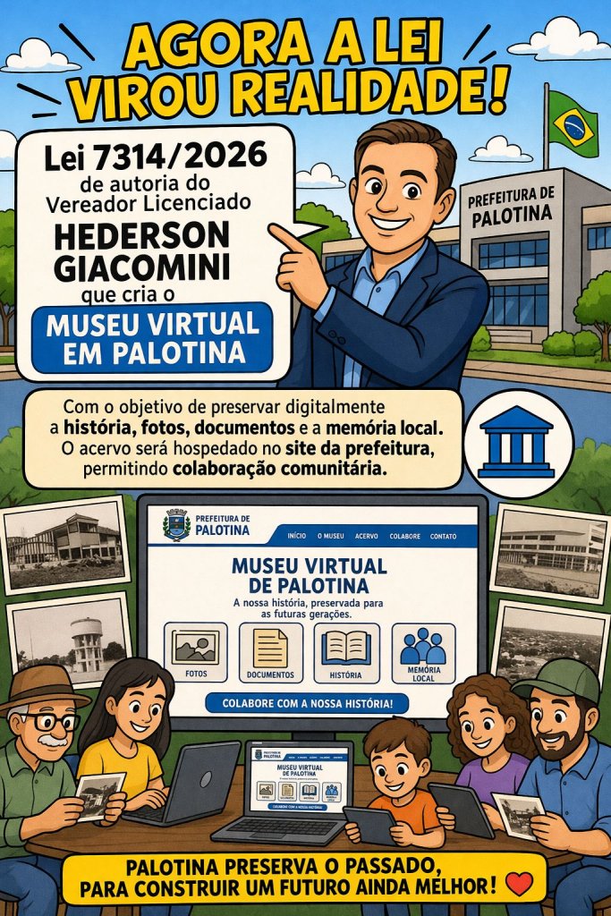 O município de Palotina passa a contar com uma importante ferramenta de preservação histórica e cultural. A Lei nº 7.314/2026, de autoria do vereador licenciado Hederson Giacomini, institui oficialmente o Museu Virtual de Palotina.