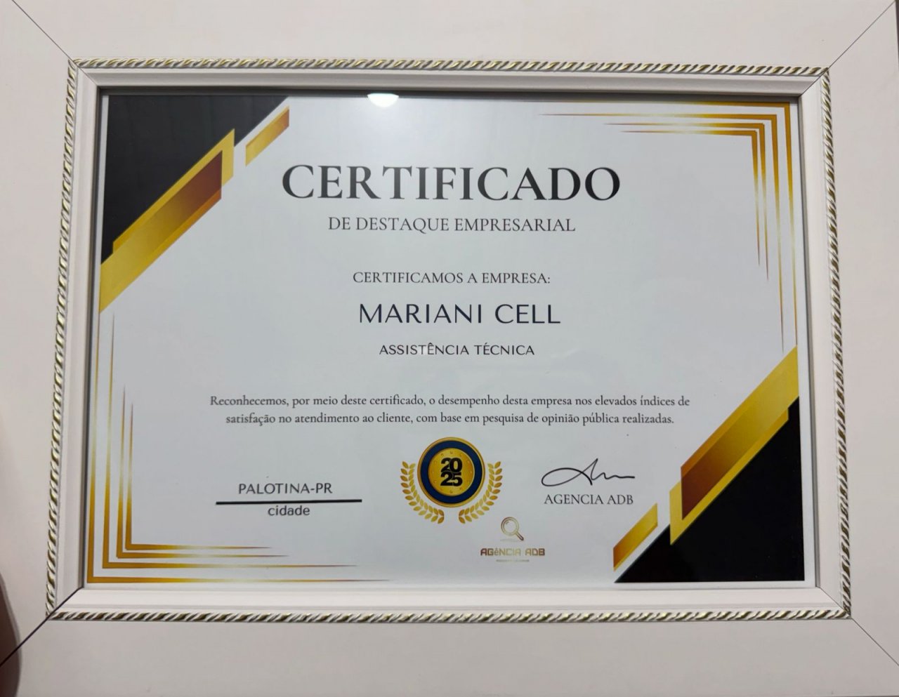 A Mariani Cell, empresa especializada em assistência técnica e acessórios para celulares, recebeu o Certificado de Destaque Empresarial 2025, reconhecimento que reforça a qualidade dos serviços prestados e o alto índice de satisfação dos clientes em Palotina.