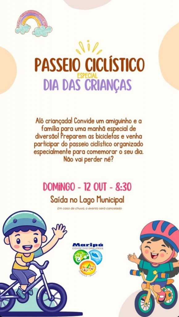 O Dia das Crianças será comemorado de forma divertida e saudável em Maripá! No próximo domingo, 12 de outubro, a partir das 8h30, a Prefeitura convida todas as famílias para participarem do Passeio Ciclístico Especial, um evento preparado especialmente para celebrar essa data tão especial.