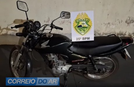 Diante da situação, os policiais se deslocaram até o local indicado e encontraram a motocicleta conforme descrito. Após consulta ao sistema pelo emplacamento, foi constatado que o veículo possuía registro de roubo ocorrido na madrugada do mesmo dia na cidade de Guaíra.