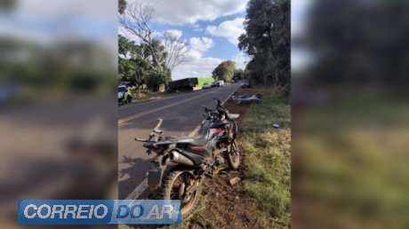 Um grave acidente de trânsito foi registrado no início da tarde desta quinta-feira (10) na rodovia PR-473, no quilômetro 32 metros, no trecho que dá acesso à BR-277, em Espigão Alto do Iguaçu, no Paraná. A colisão envolveu uma motocicleta Honda XRE 190 SE e um caminhão Mercedes-Benz Atego 2426, ambos com placas do município.