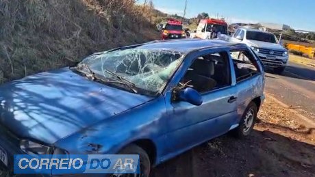 Carro cai na pista da BR-158 após motorista perder o controle da direção na tarde deste sábado (19) em Pato Branco, no Sudoeste do Paraná.