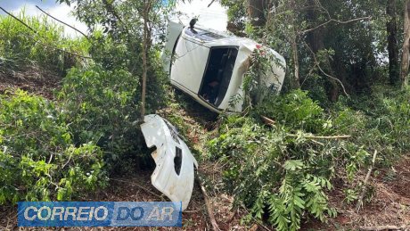 Mulher de 49 anos ficou ferida após capotar o carro que dirigia no km 366 da PR-180, em Cascavel, na tarde de segunda-feira (27).