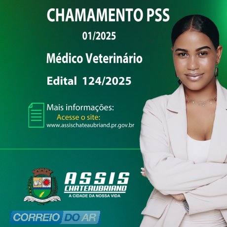 O município de Assis Chateaubriand publicou nesta segunda-feira (29) a convocação de candidatos aprovados em Processos Seletivos Simplificados (PSS) para o cargo de Médico Veterinário. O edital PSS nº 124/2025 publicado no diário oficial, refere-se à 17ª convocação do PSS 01/2025.