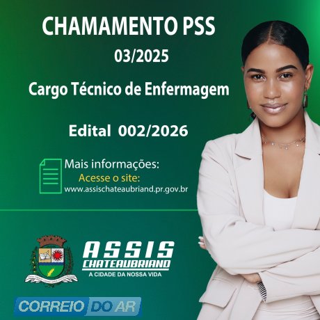 O município de Assis Chateaubriand publicou nesta sexta-feira (9) a convocação de candidato aprovado no Processo Seletivo Simplificado (PSS) para o cargo de Técnico de Enfermagem. O edital PSS nº 002/2026 publicado no diário oficial, refere-se à 11ª convocação do PSS 03/2025.