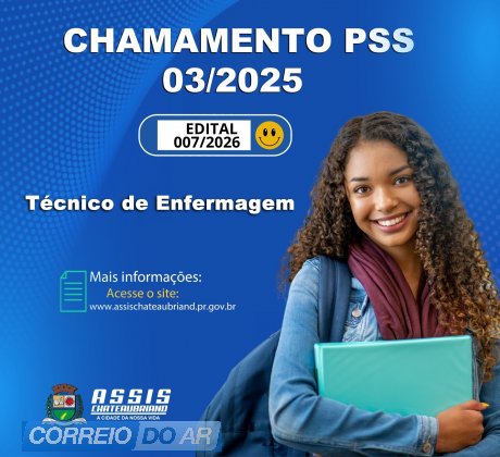 O município de Assis Chateaubriand publicou nesta segunda-feira (26) a convocação de candidato aprovado no Processo Seletivo Simplificado (PSS) para o cargo de Técnico de Enfermagem. O edital PSS nº 007/2026 publicado no diário oficial, refere-se à 15 ª convocação do PSS 03/2025.