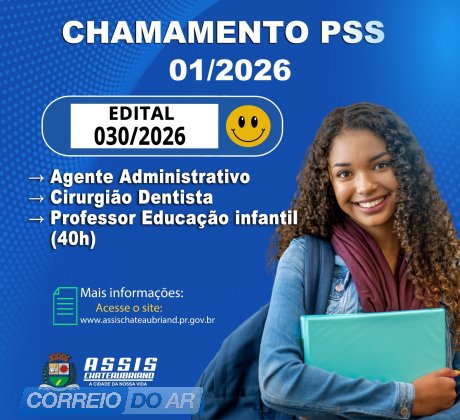 O município de Assis Chateaubriand publicou nesta sexta-feira (20) a convocação de candidatos aprovados no Processo Seletivo Simplificado (PSS) para os cargos de Agente Administrativo, Cirurgião Dentista e Professor de Educação infantil PSS (40h). O edital PSS nº 030/2026 publicado no diário oficial, refere-se à 3ª convocação do PSS 01/2026.