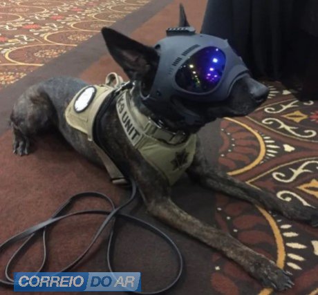 A K-9 HELM, empresa californiana, criou um capacete para proteger os cães farejadores e ainda passar informações em tempo real para seus adestradores.
