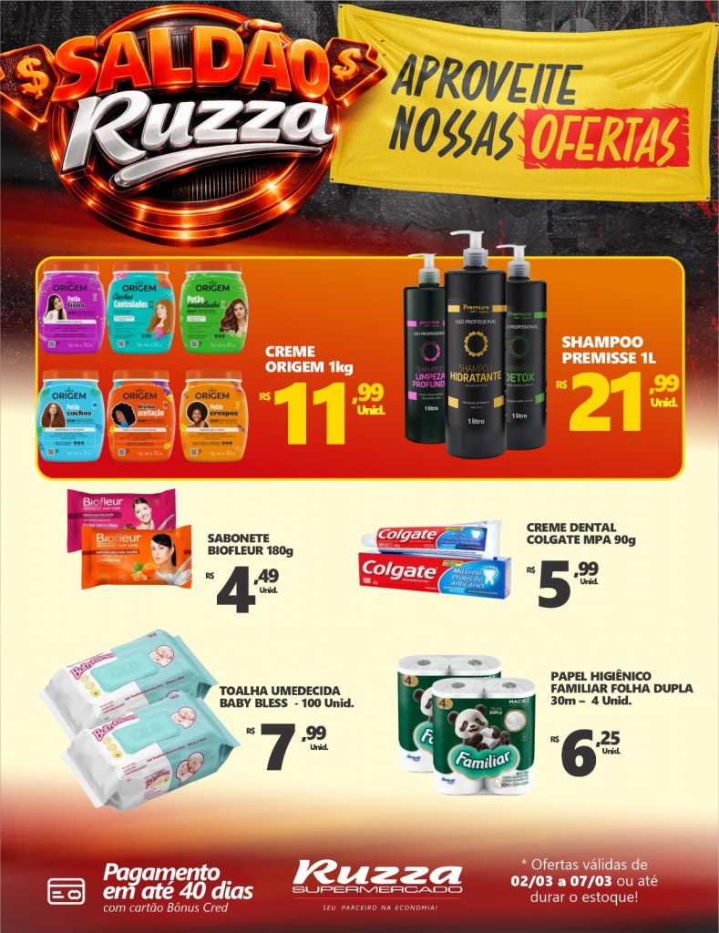 Já as promoções do “Saldão Ruzza” têm validade de 02/03 a 07/03, também válidas enquanto durarem os estoques.