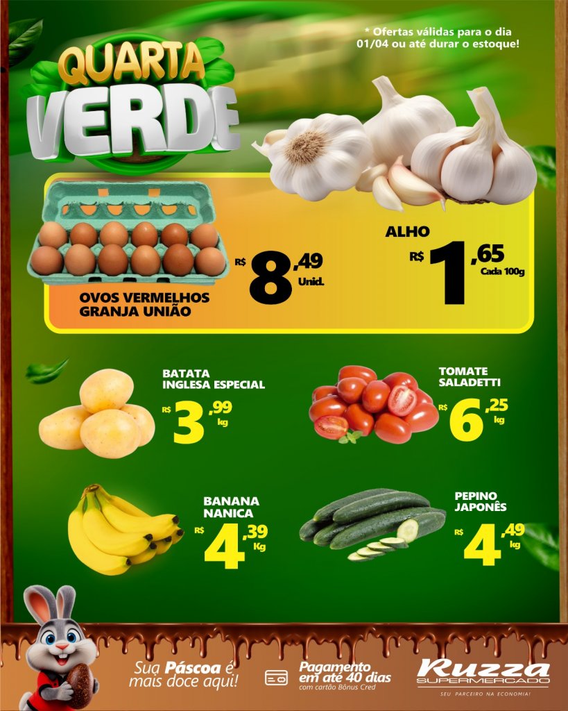 Hoje é Quarta Verde, o dia ideal para aproveitar frutas, verduras e legumes fresquinhos direto para sua mesa com preços especiais.