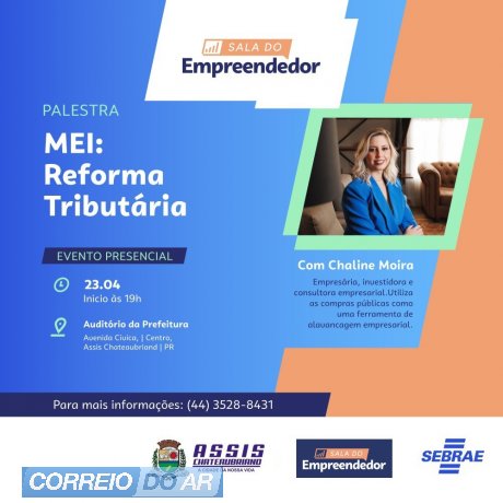 No próximo dia 23 de abril, às 19h, no Centro de Convenções (Auditório Municipal) de Assis Chateaubriand acontece uma palestra essencial para os Microempreendedores Individuais (MEIs). Promovido pela Sala do Empreendedor, o evento gratuito abordará a Reforma Tributária e seus impactos.
