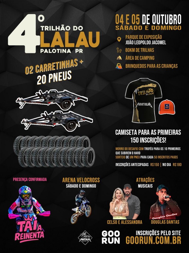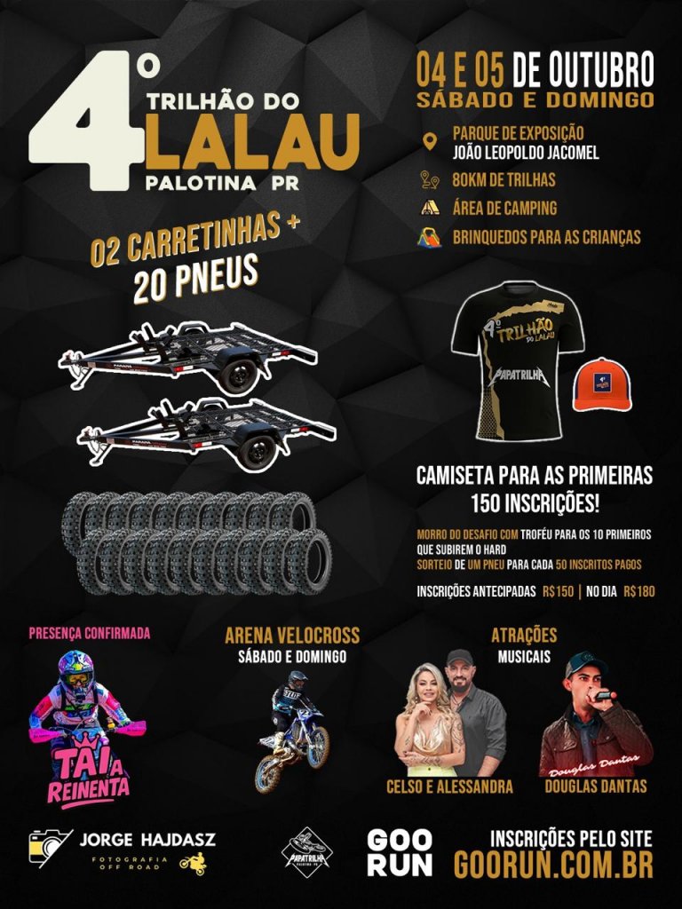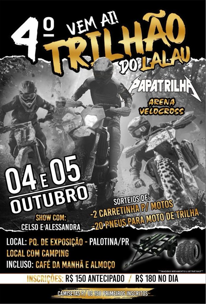 Nos dias 4 e 5 de outubro, Palotina será palco de mais uma edição do Trilhão do Lalau, evento tradicional que reúne amantes de motociclismo e trilhas na região. A programação acontece na Arena Velocross, localizada no Parque de Exposições do município, e promete muita emoção e adrenalina.